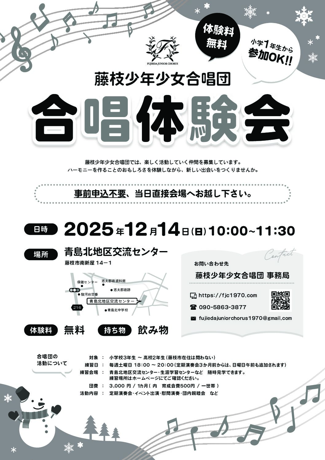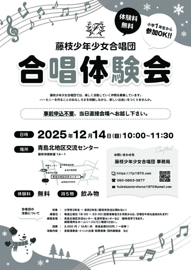 うたが好きな小・中・高校生のみなさん、藤枝少年少女合唱団の団員たちと一緒に、楽しく合唱しましょう。